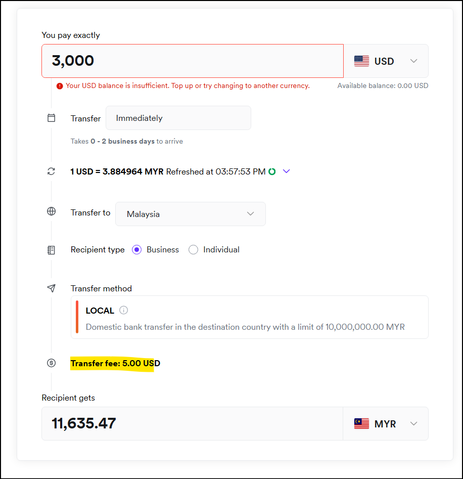 なお、ラブアン法人ビザの維持要件である月額10,000リンギに近い金額(切りよくUSD3,000)をリンギットで送金する場合にどの程度の手数料かを確認したところ、この場合も手数料はUSD5でしたので、一般の銀行口座で銀行の為替レートで両替のうえでMYR送金する場合と比較すれば、トータルではこちらが安いかもしれません(銀行側の両替手数料などがブラックボックスですので正確な比較ができませんが)。