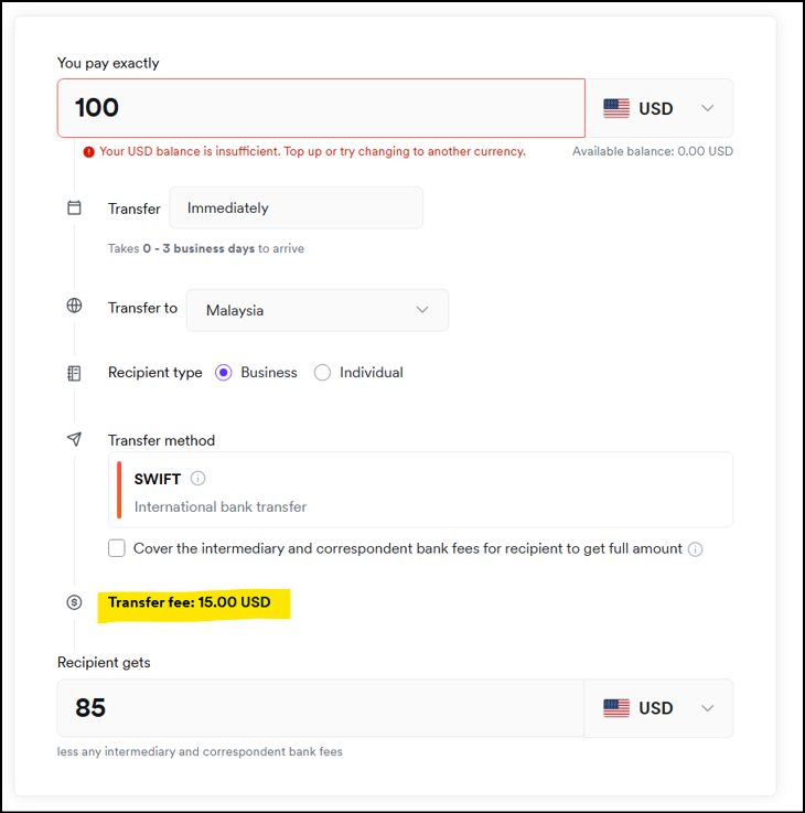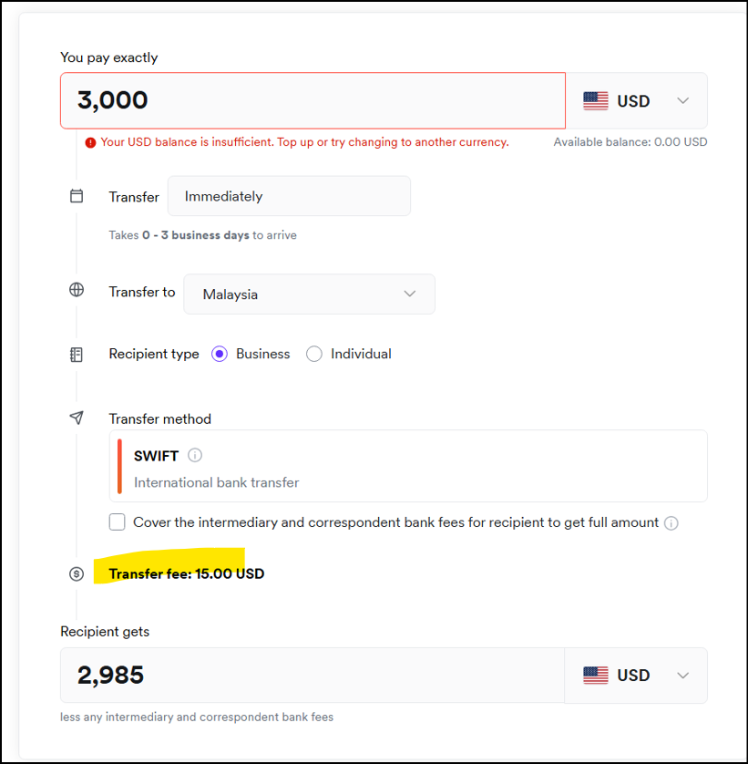 ラブアン法人はマレーシア国内のラブアン信託会社等にUSD建てで送金する場面が多々ありますので、USD建て送金についても付記しておきますと、送金先をマレーシアに指定した場合はUSD100を送金する場合も、USD3,000を送金する場合も手数料はUSD15でした。