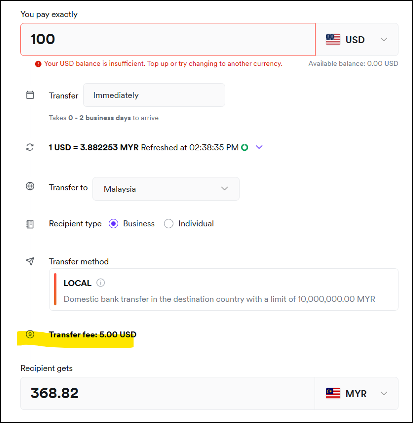 ラブアン法人の場合、外貨での海外送金だけでなく、マレーシア国内向けにリンギットで送金する場面もあるかと思います。この点、マレーシア国内の相手に対して、リンギットに両替をして送金をすることは可能ではあるのですが、弊社のAirwallex口座で試したところ、送金手数料として一回あたり最低USD 5 を要しました(下記画像をご覧ください、USD100をMYRに両替して送金する場合の手数料としてUSD5と記載されております)。