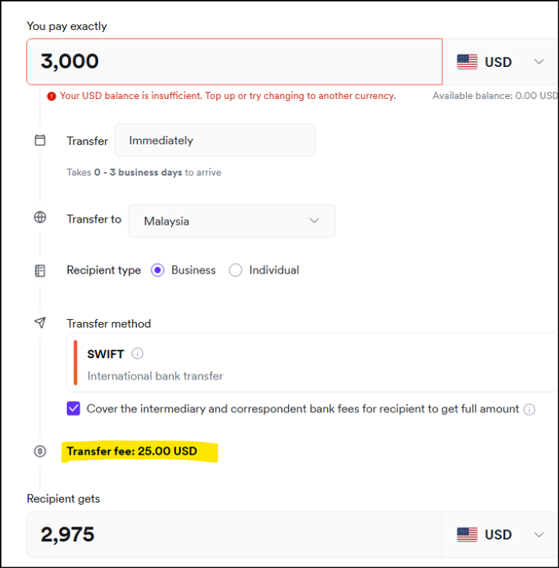 銀行で海外送金をする場合と同様に、請求書に記載された請求額の満額が相手方の口座に着金するように「送金に関する手数料は中継銀行の手数料も含めて送金者の負担とする」という送金方法も取れるようになっています。この方法を取った場合、送金手数料としてUSD25と表示されました。